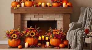 Arrange pumpkins of different sizes along your mantel, filling them with seasonal flowers, pinecones, and candles. It creates a cozy, eye-catching display that ties the whole room together.
