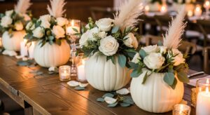 For autumn weddings, use white pumpkins filled with roses, eucalyptus, or pampas grass. These arrangements bring rustic charm and refined elegance to your tablescape.