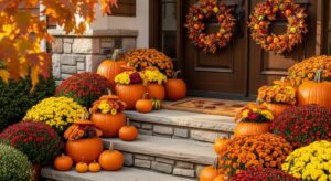 Line pumpkins of varying sizes on your front porch, each filled with colorful flowers. This layered look instantly creates a welcoming, festive atmosphere.