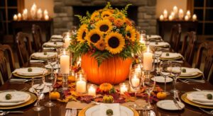 A large pumpkin overflowing with flowers makes a breathtaking centerpiece for Thanksgiving dinner or a cozy fall gathering. Surround it with candles for extra warmth.