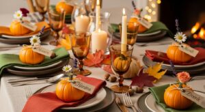 Use tiny pumpkins with a single bloom and a handwritten name tag at each guestโ€™s place setting. They double as dรฉcor and memorable keepsakes.