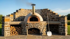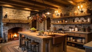 Use stacked stone, natural textures, and wood elements for a warm, lodge-inspired outdoor cooking space.