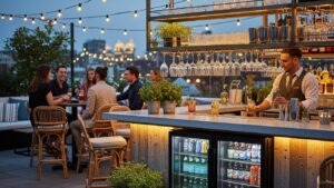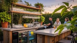 Perfect for parties—include a bar rail, mini fridge, and drink station to keep beverages within reach.