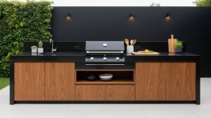 21. Minimalist Black-and-Wood Outdoor Kitchen