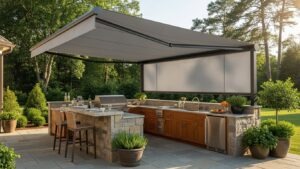 A retractable awning provides shade when needed and keeps the kitchen protected from weather changes.