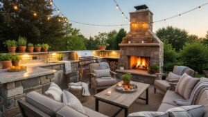 Pair your cooking area with an outdoor fireplace for warmth, charm, and year-round usability.