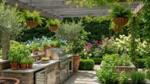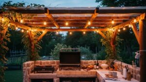 A pergola provides shade, defines your outdoor kitchen area, and lets you add lights, plants, or curtains for ambiance.