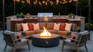 Build a cozy gathering area beside your outdoor kitchen with a fire pit for roasting, relaxing, and chatting.
