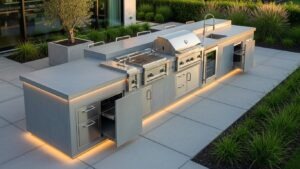 Include a grill, oven, sink, fridge, warming drawer, storage, and ample countertop space for a complete chef-style layout.