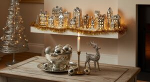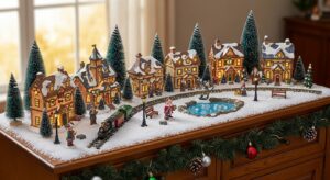 Arrange small ceramic houses, reindeer figurines, and bottle brush trees on a sideboard or shelf for a nostalgic display.