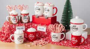 Set up a cozy hot cocoa station with mugs, marshmallows, candy canes, and festive napkins — decorative and functional!