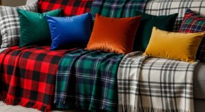 Swap out neutral cushions and throws for warm, festive fabrics like plaid, velvet, or faux fur. These textures instantly add coziness and depth.