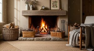 Incorporate wooden trays, wicker baskets, or birch logs for a natural, farmhouse-inspired look that radiates warmth.