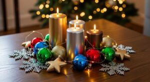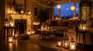 Soft lighting sets the mood. Opt for warm white fairy lights, LED candles, or lanterns to give your living room that magical Christmas glow.