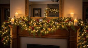 Drape garlands of pine or eucalyptus over your mantel and weave fairy lights through them. Add candles or lanterns for a gentle glow.