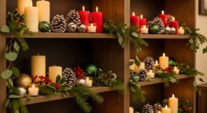 Mix in small ornaments, greenery, and candles among your books and framed photos for subtle seasonal styling.