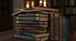 Stack vintage books beside candleholders for a cozy, library-inspired holiday corner.