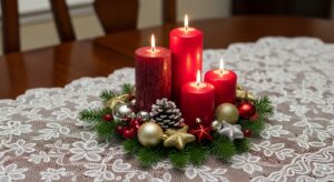 A lace or embroidered tablecloth instantly adds elegance and heritage to your Christmas table setting.
