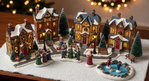 Set up a miniature village scene on a mantel or side table. Include vintage-style houses, street lamps, and carolers for a nostalgic touch.