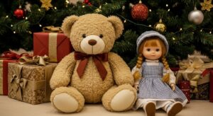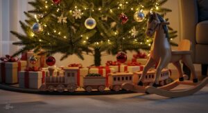 Small teddy bears, dolls, and rocking horses arranged around the tree add storybook nostalgia.