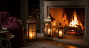 Old-fashioned lanterns and taper candles bring soft, romantic lighting reminiscent of Christmas past.