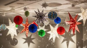 Retro paper ornaments or honeycomb decorations bring a cheerful mid-century flair to your holiday decor.