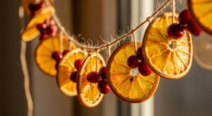 String garlands made of dried oranges, popcorn, and cranberries for a natural, traditional look.