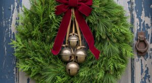 Choose a rustic or evergreen wreath adorned with old-fashioned sleigh bells or velvet ribbon for a nostalgic welcome.