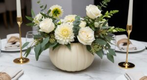 For a more sophisticated style, use a white pumpkin as your vase. Fill it with soft florals such as cream dahlias, ivory roses, and eucalyptus. This clean and chic arrangement is perfect for weddings, dinner parties, or modern home décor. -