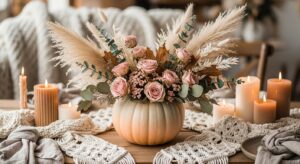 Pastel-toned or muted pumpkins pair beautifully with pampas grass, dried florals, and blush-toned roses. This arrangement creates a soft, dreamy aesthetic that complements cozy bohemian décor, especially when paired with candles and macramé runners.