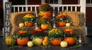 Turn your front porch into a fall wonderland with clusters of pumpkins in different sizes, each filled with mums, ivy, or cascading greenery. Add lanterns, hay bales, and a seasonal welcome sign for a festive outdoor display that greets guests with charm. -