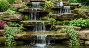 Layers of natural stones create a cascading waterfall that blends beautifully with plants and outdoor greenery.