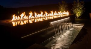 A modern showpiece combining flame and flowing water for a striking nighttime feature.