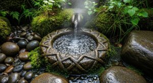 A carved stone basin with a small bubbling spout blends effortlessly into nature.