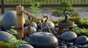 Inspired by Japanese gardens, bamboo fountains provide soothing sound and a peaceful aesthetic for relaxation areas.