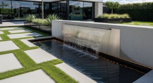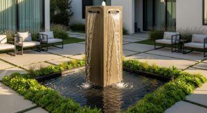 A sleek water wall made of stainless steel adds luxury and a spa-like atmosphere to your yard.