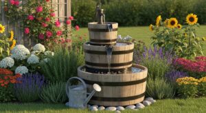 A wooden barrel with cascading water channels gives your outdoor space a cozy farmhouse feel.