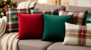 Add festive throw pillows in plaid, velvet, or embroidered designs to your sofas and chairs for an instant touch of coziness.