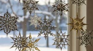Delicate paper or metallic snowflakes suspended from the ceiling or windows add a magical winter touch.