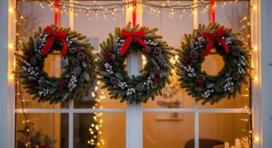 Hang string lights, stars, or wreaths in front of windows for a glowing, festive effect.