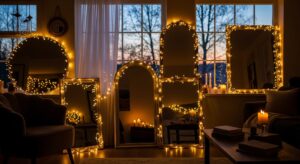 Wrap fairy lights around mirrors, windows, and shelves for a soft, magical glow that enhances the festive feel.