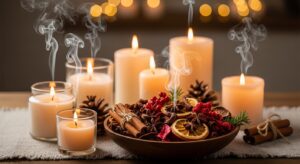 Candles, diffusers, or dried oranges bring in cozy Christmas scents like pine, cinnamon, and vanilla.