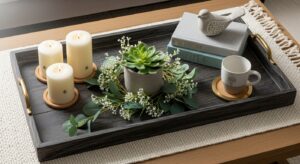 Decorate with a tray holding ornaments, candles, pinecones, and mini trees for a balanced, seasonal vignette.