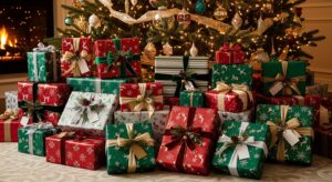 Use beautifully wrapped faux gifts under the tree or in corners to add visual fullness and festive flair.