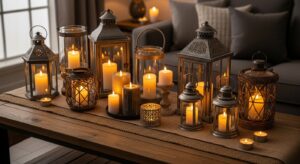 Set up groups of candles or lanterns to create a warm, inviting ambiance — use LED options for safety.