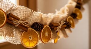 For a cozy farmhouse look, create a garland from twine, burlap, and dried orange slices. Add cinnamon sticks or pinecones to fill your home with a warm, festive scent.