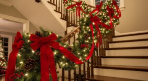 Wrap a faux or real pine garland around your banister and weave string lights through it. For an elevated touch, add ribbons, ornaments, or small bows that match your color theme.