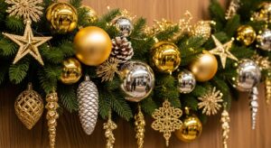 Upgrade your garland by incorporating mini ornaments that match your Christmas tree. Metallics, glass balls, and glittered details will give your display an extra sparkle.