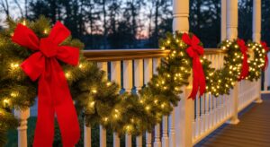 Extend your decor outdoors by draping garlands along fences, porch railings, or balcony edges. Use weather-resistant greenery and solar lights to keep it shining all season long.