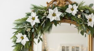 Add silk flowers such as white roses, poinsettias, or hydrangeas to your greenery for a soft, elegant vibe. This works beautifully over mirrors, windows, or headboards.